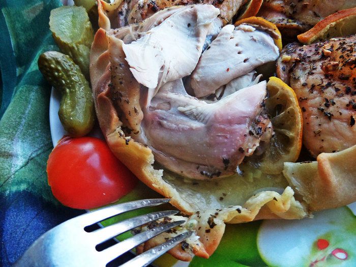 Сын делал пиццу и остался кусочек теста, из которого я решила слепить основу,которая сохранила все куриные соки, а пропитанное тесто стало неимоверно вкусным, хрустящим и было растерзано вмиг Даже лимон как с гриля получился!