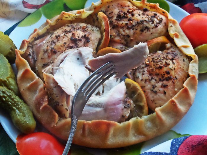 Если осталось немного теста, вот идея приготовить и подать курочку на съедобной тарелке