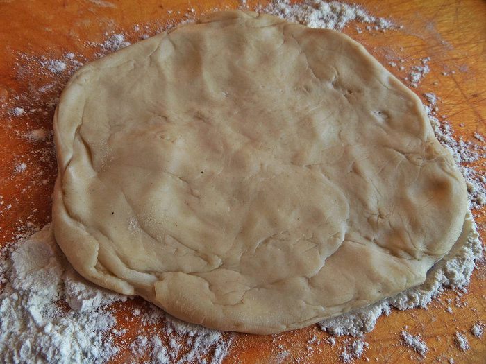 Тесто подойдёт любое, у нас сделано простейшее из масла, воды и муки и соли.
