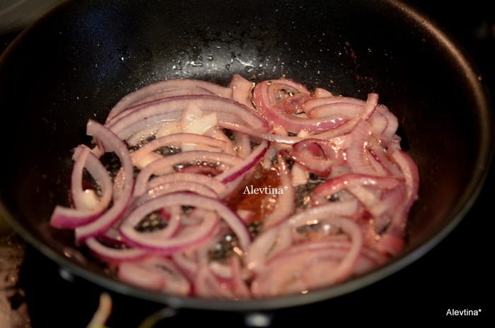Обжарить на горячей сковороде с 1 стол.л жира от бекона красную луковицу порезанную тонко до мягкости.