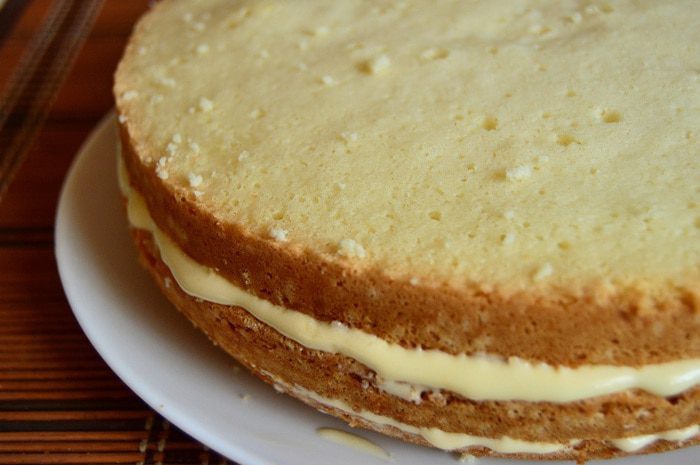 Собираем торт. Нижний и средний коржи пропитываем сиропом, затем все коржи смазываем лимонным кремом. Верхний корж можно присыпать какао.