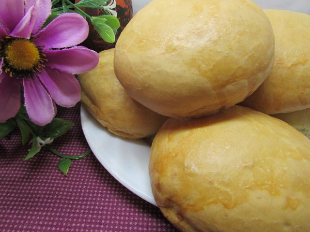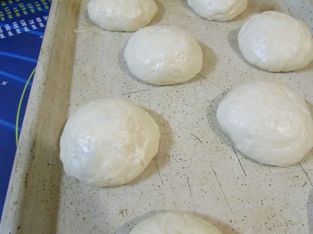 Смазать руки растительным маслом. Формовать булочки, у меня получилось 8 булочек примерно по 70 грамм. Оставить на 1 час для расстойки. Как только булочки увеличатся в 2-2,5 раза, смазать их молоком (2 ст. л.) + растительное маслом (1 ст. л.). Отправить в разогретую духовку (200 градусов). Выпекать 30 минут.