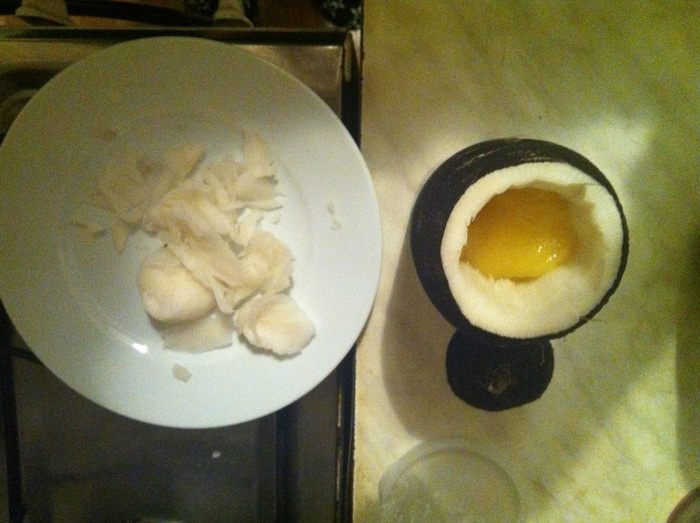 Ножом и вилкой аккуратно, чтобы не повредить стенки вырезаем сердцевину, стенки примерно 0,5 см.