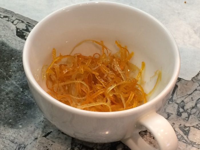 Для их приготовления крупный апельсин тщательно помыть, надрезать кожуру по «меридианам», очистить. Полученные лепестки нарезать тонкими полосками.