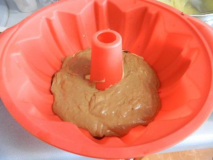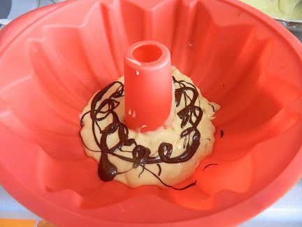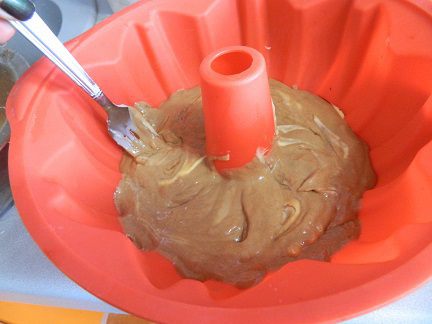 Форму смазать маслом. У меня силиконовая, я не смазываю. Выложить часть белого теста (слои будут чередоваться), затем немного растопленного шоколада.