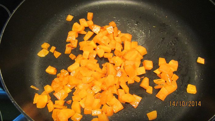 В сотейнике разогреваем небольшой кусочек сливочного масла и 1 ст.л. оливкового масла. Готовим порезанную мелкими кубиками тыкву до мягкости минут 10. В последние несколько минут слегка увеличиваем огонь, чтобы она слегка зазолотилась. Немного ее остужаем.