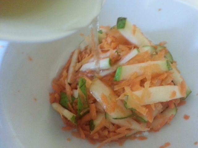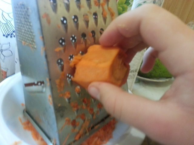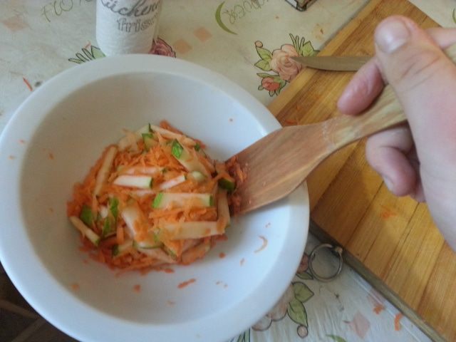 Помыть продукты.морковь натереть на терке и положить в тарелку.Помять кулаком для того,чтобы она дало сок.
