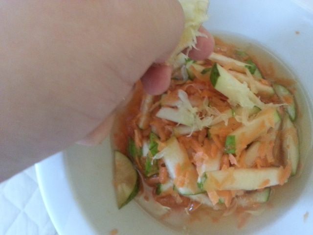 Лимон выжить в салат. Вторая долька служит кислотой. Мякоть руками выдернуть и положить в салат. Поставить в холодильник на одну мин.Готово!!!!ПРИЯТНОГО АППЕТИТА!!