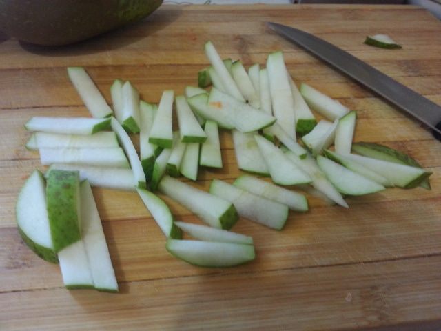 Грушу нарезать ломтиками и положить к моркови.