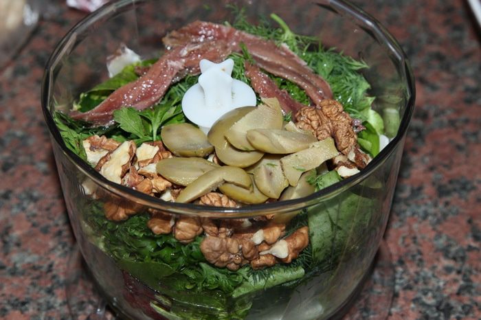 для соуса листья салата, оливки, орехи, 2 столовые ложки оливкового масла, 4 анчоуса и половину пучка петрушки отправляем в блендер
