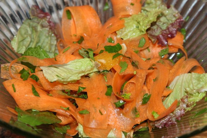 морковь нарезаем тоненькими пластинами, петрушку рубим, два колечка апельсина разбираем на кусочки, три-четыре салатных листа нарываем крупно и все смешиваем.