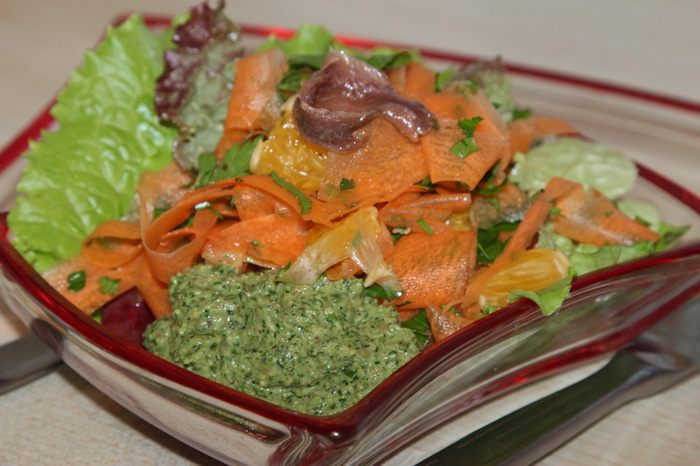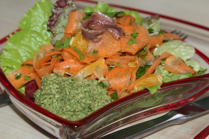 сверху выкладываем морковно-апельсиновую смесь с петрушкой и 1 анчоус, отдельно в салатнике выкладываем 1 чайную ложку соуса.