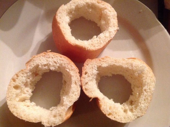 Берем три кусочка багета и вырезаем у них мякоть.
