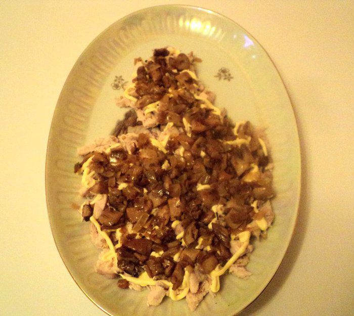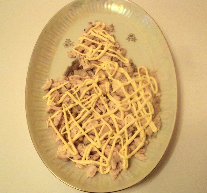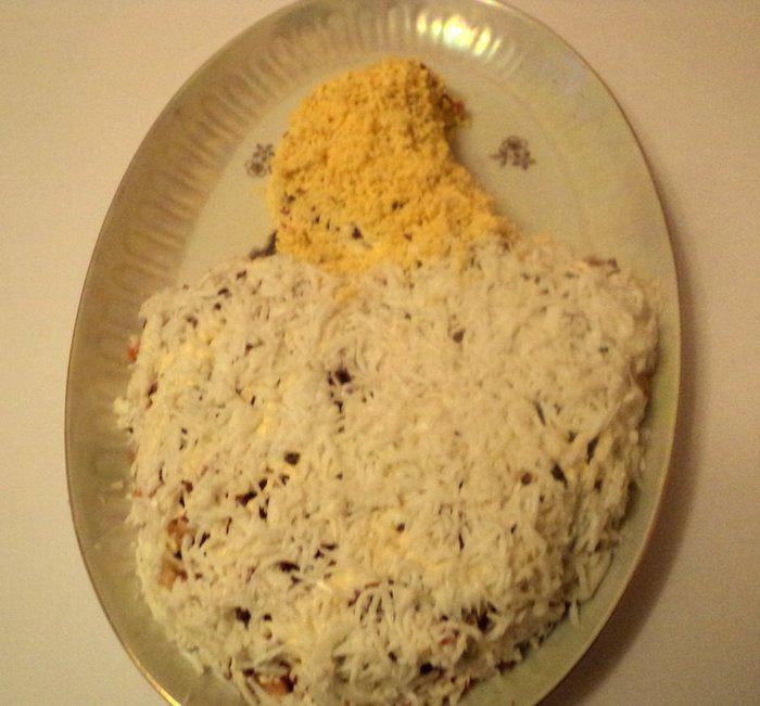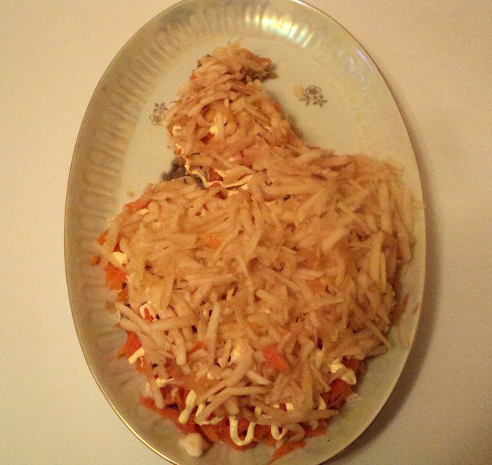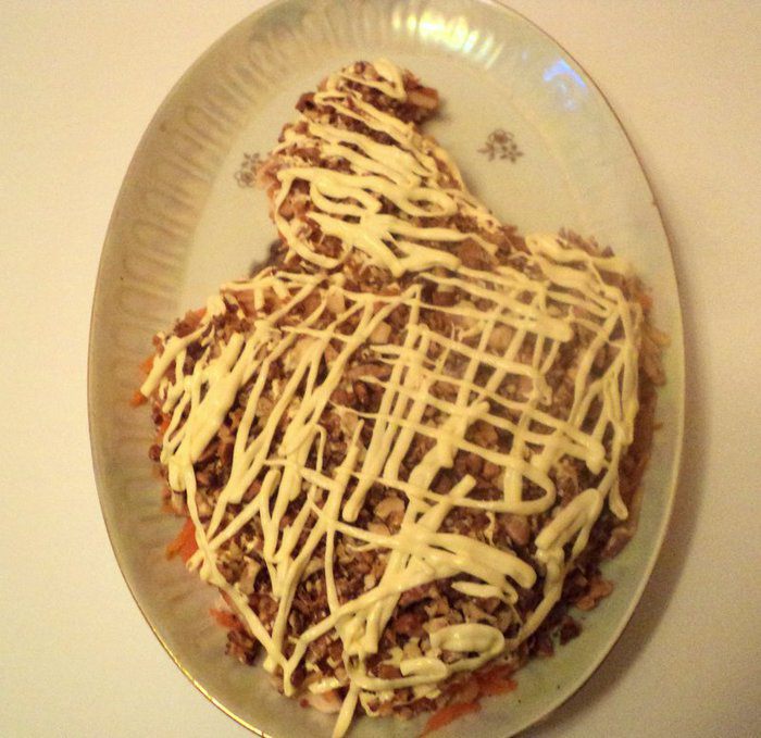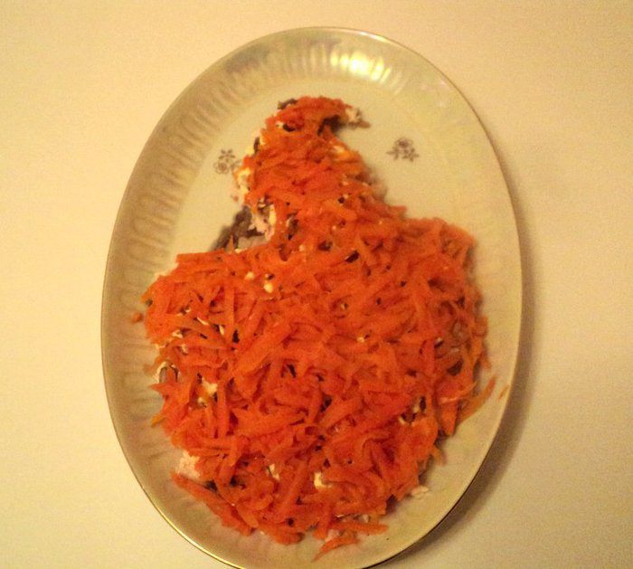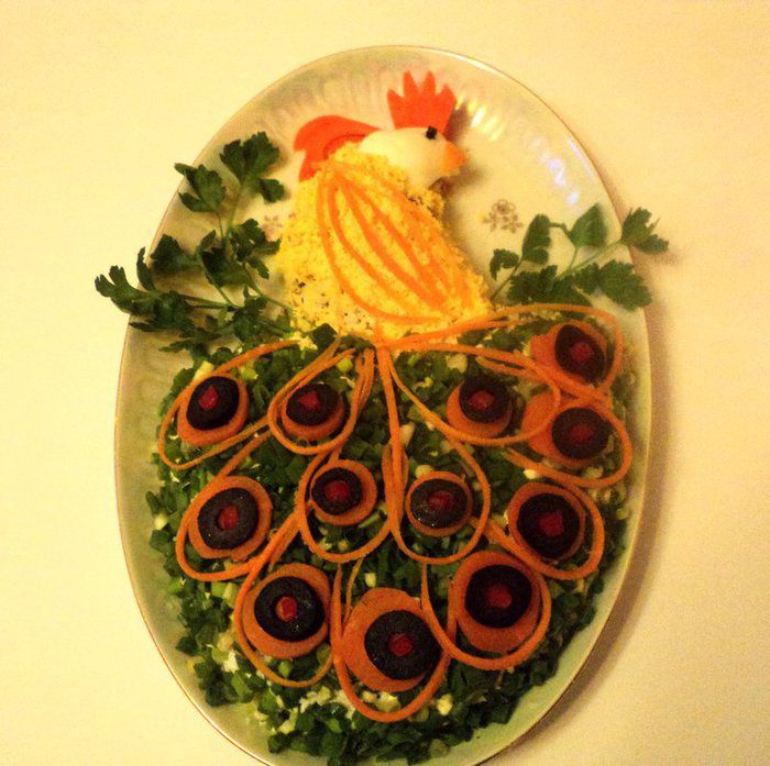 Из яичного белка вырезать голову жар-птицы, клюк, корона, перья на голове из вареной морковки, глаз – из гвоздички или черного перца. Зеленый лук мелко порезать и посыпать на белковый слой, смазанный майонезом. Из моркови, оливок, кусочков сладкого перца сделать хвост птицы, из петрушки – ветку на которой сидит птица. Дать салату настояться 2-3 часа в холодильнике и можно подавать. Приятного аппетита!