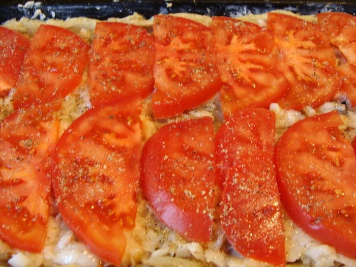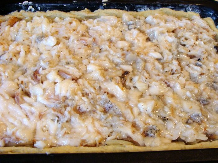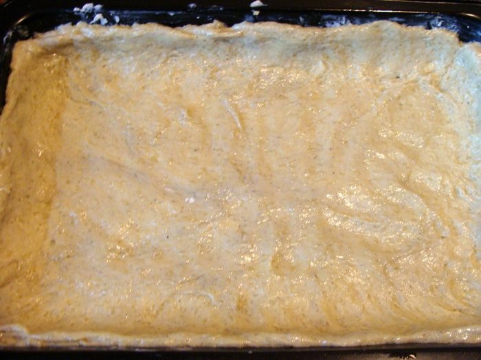 В картофельную массу всыпать просеянную муку и замесить тесто. У меня оно было липкое, чтобы распределить его по форме, я смазала руку растительным маслом.