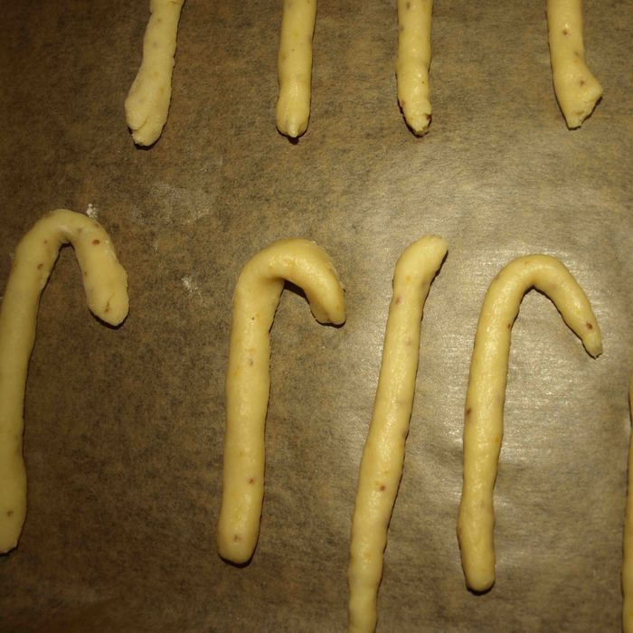 Сформировать палочки (не очень толстые), из палочки можно сделать клюку) выкладываем на противень застеленный пекарской бумагой и отправляем в заранее разогретую на 180 гр духовку и выпекаем до золотистого цвета. Примерно 15-20 минут, зависит от вашей духовки.