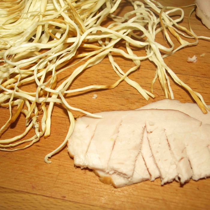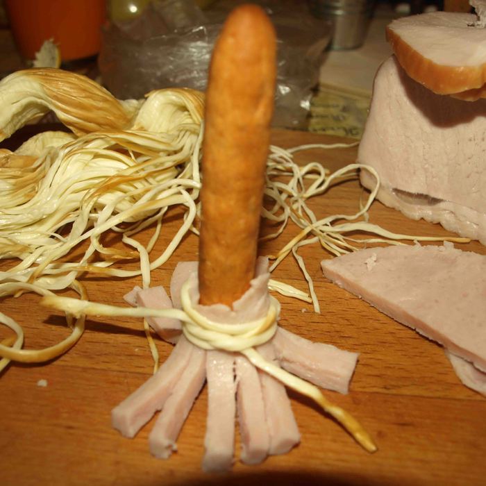 Копченый сыр косичкой расплетаем, и делает веревки. Ветчину тонко режем, нарезаем по краям.