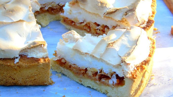 Взбейте белки с оставшимся сахаром в крепкую пену. Выложите на испеченное тесто натертую айву, покройте взбитыми белками и снова поставьте в духовку.