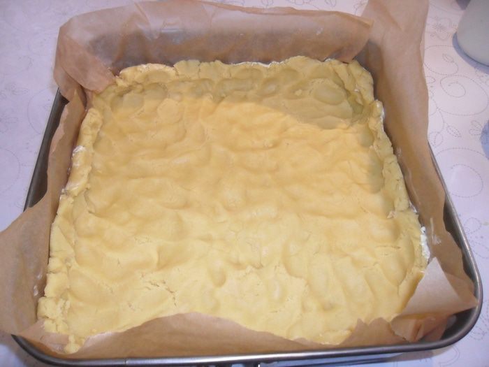 Выложите руками тесто и сделайте бортик, и отправьте в разогретую до 200С духовку на 20 минут.