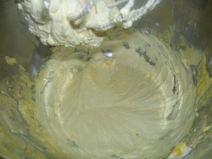 Желтки разотрите со 100 гр сахара и маргарином добела.
