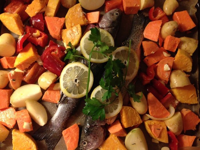 Овощи вымыть, по необходимости почистить. Для этого рецепта хорошо подходят корнеплоды (молодой картофель, батат, морковь, брюква, лук), тыквы разных сортов, сладкий перец, помидоры... Овощи порезать кубиками, сложить в миску, добавить оливковое и сливочное масло, соль, перец, травки по вкусу (здесь тмин), руками хорошо перемешать.