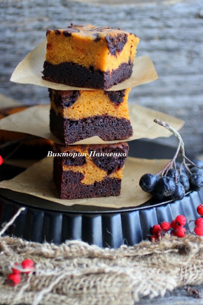 Чуть больше половины шоколадного теста выложить в подготовленную форму, разровнять поверхность. Сверху выложить тыквенное тесто. Оставшееся шоколадное тесто выложить столовой ложкой на тыквенное в нескольких местах.