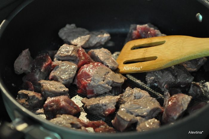 Говядину посолить и поперчить. Разогреть на сковороде масло, обжарить говядину со всех сторон примерно 10 мин. переложить в жаровню или в кастрюлю с тяжелым дном.