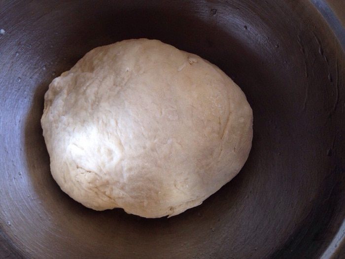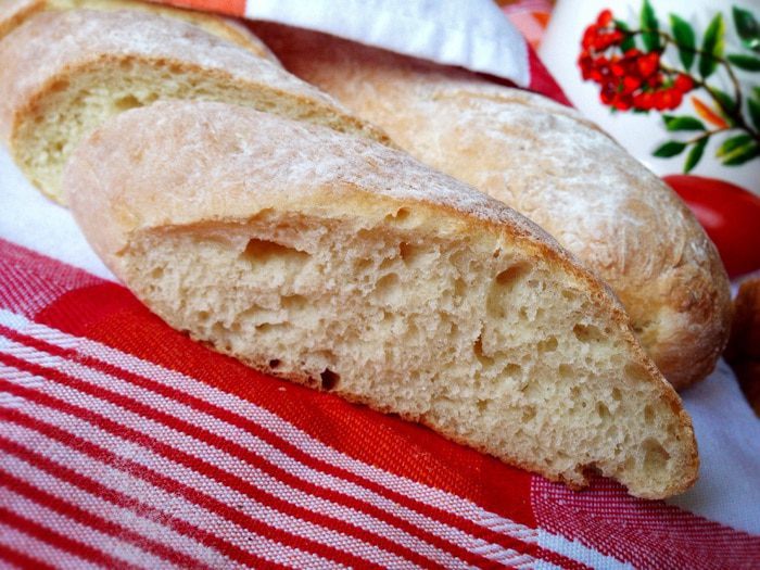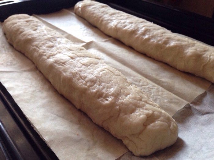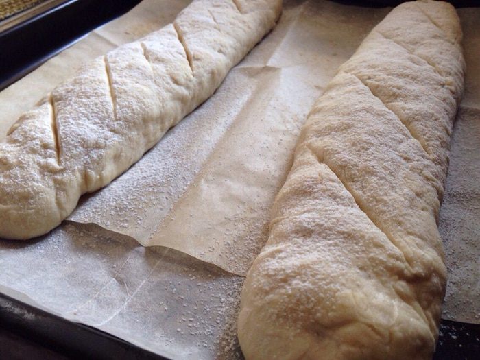 Затем разделить тесто на две части, смазав руки оставшимся растительным масло. И сформировать багеты(просто вытянуть каждую часть багет). Выложить багеты на противень,застеленный бумагой для выпечки и присыпанной чуть мукой. Накрыть багеты полотенцем и дать им отдохнуть еще 15 минут.