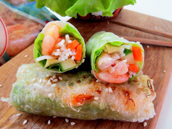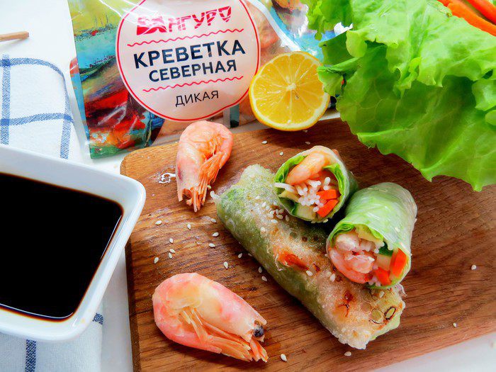 По желанию роллы можно обжарить во фритюре, получится очень вкусно. Я обжарила на том же чесночном масле, которое осталось от обжарки креветок.