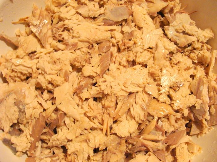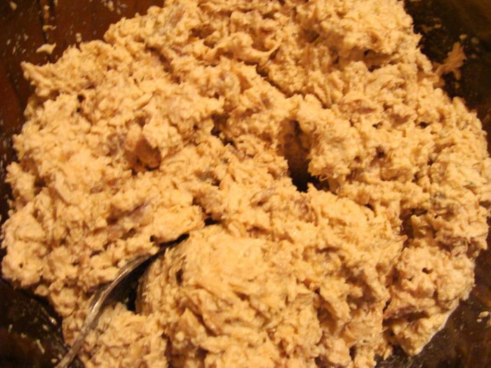 Отделить мясо от костей, измельчить руками, разделив на перышки, если хотите структуру меньше, типа паштета, значить надо перышки слегка раздавить.