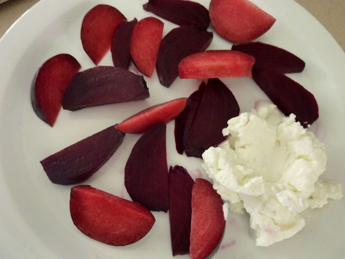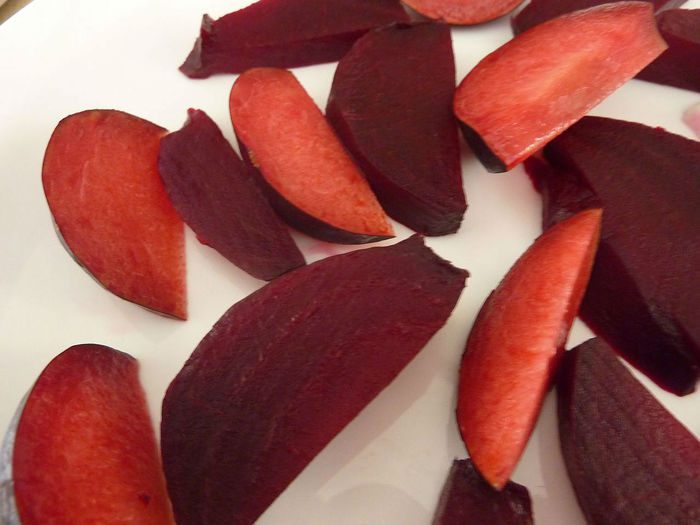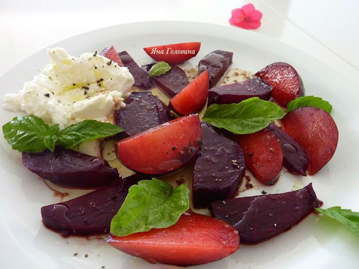 Свеклу и сливы порезать на дольки. Разложить на тарелку.