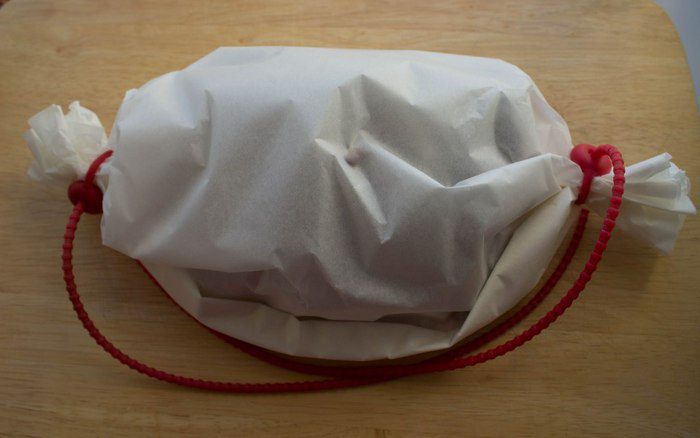 Положить подготовленную рыбу на лист пергамента, сложенный вдвое, и хорошо "запеленать". Для закрепления я использую силиконовые шнуры. Запекать в предварительно разогретой до 200 градусов духовке в течение 15 минут. Затем пергамент разрезать сверху и оставить в духовке еще на 4-5 минут. Подавать с ломтиком лимона.