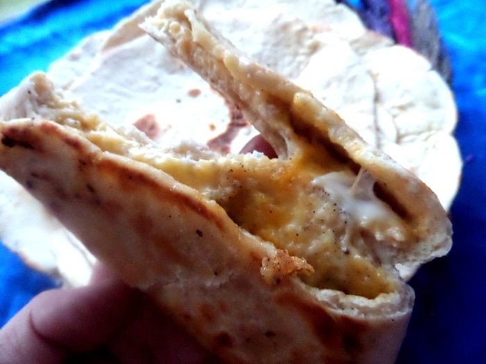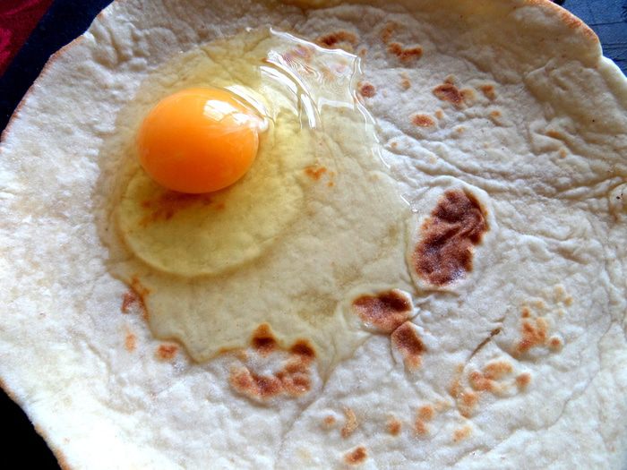 Вбиваем в центр (диаметр 20 см) яйцо и размазываем его (вилкой или силиконовой лопаточкой) по всей поверхности лавашика.