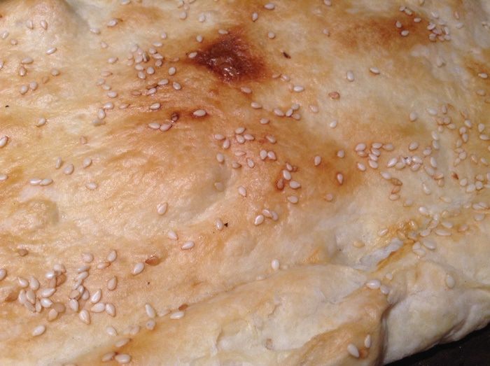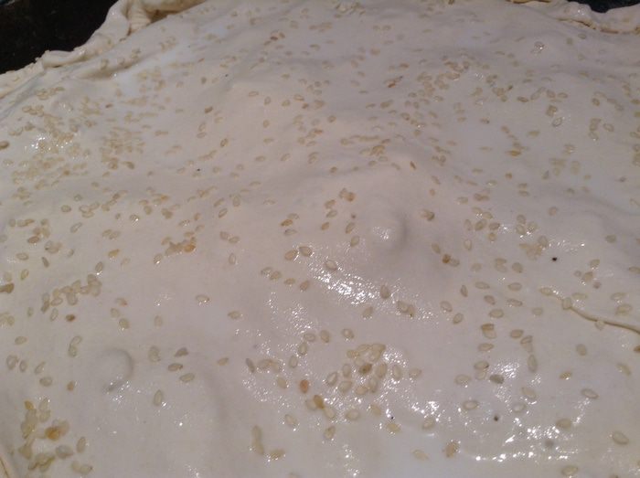Пирог смазать молоком и присыпать кунжутом.