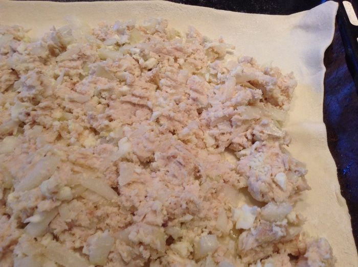 Пласты теста раскатать. Переложить на противень. На нижний пласт выложить начинку.