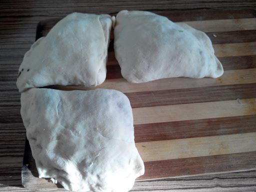 Каждую часть теста раскатать в тонкую лепешку диаметром примерно 22-23 см. На нее распределите тесто закрыв 3/4 части лепешки. (что б осталась четвертинка лепешки без фарша)