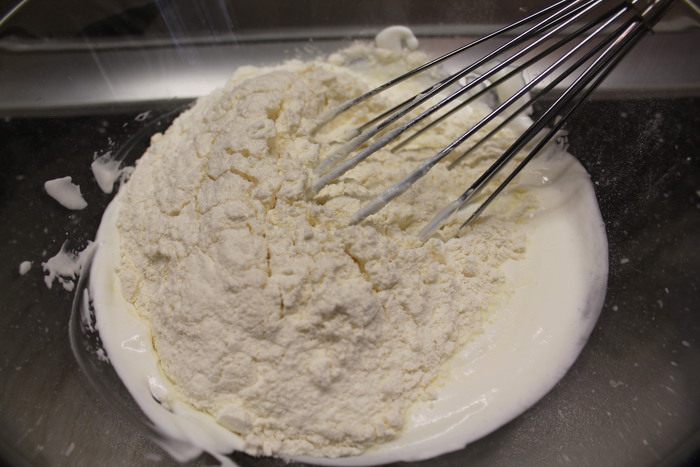 В сметану постепенно добавляем муку и хорошенько перемешиваем.