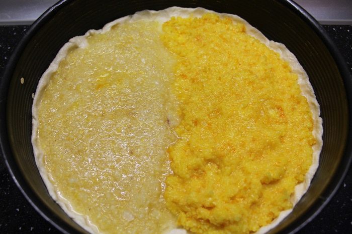 Половину теста распределяем по всей поверхности формы, сделав небольшие бортики. Визуально делим форму на две половины. На первую выкладываем измельченный лимон, на вторую - апельсин.