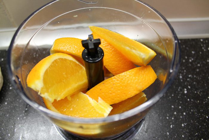 Апельсин нарезаем дольками и вместе с кожурой измельчаем в блендере.