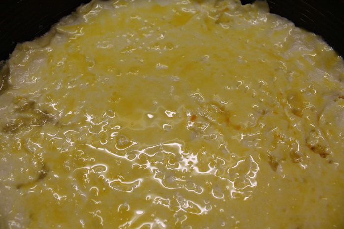 Далее добавляем растопленное сливочное масло и перемешиваем до однородной массы.