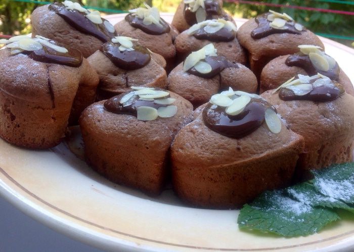 Расстопить черный шоколад на водяной бане, и полить им уже остывшие маффины, посыпать сверху лепестками миндаля.