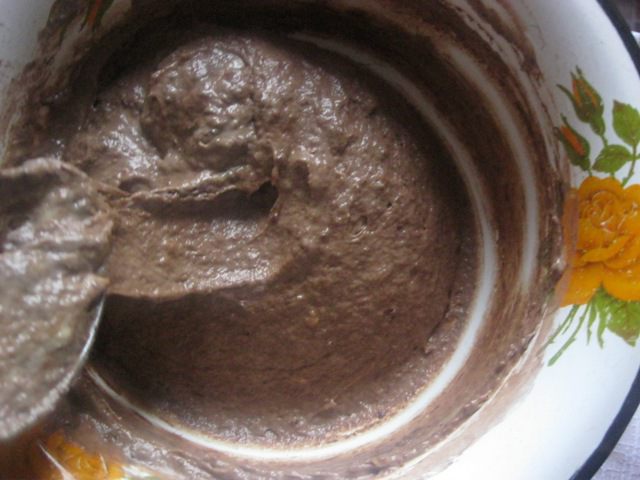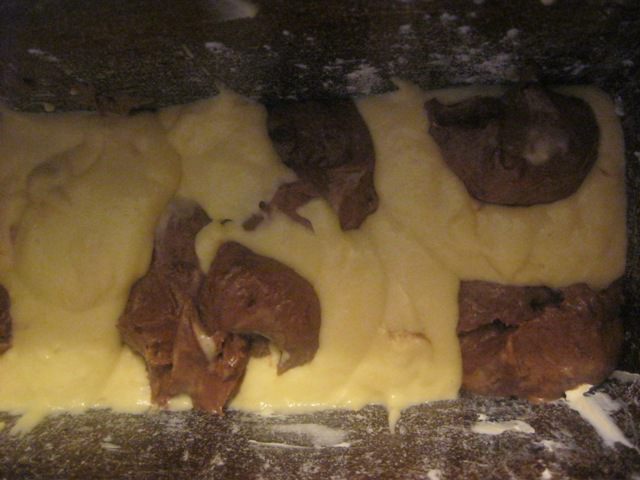 Форму смазать маслом и присыпать мукой. Выкладывать поочередно - ложку темного теста, ложку светлого, в шахматном порядке)
