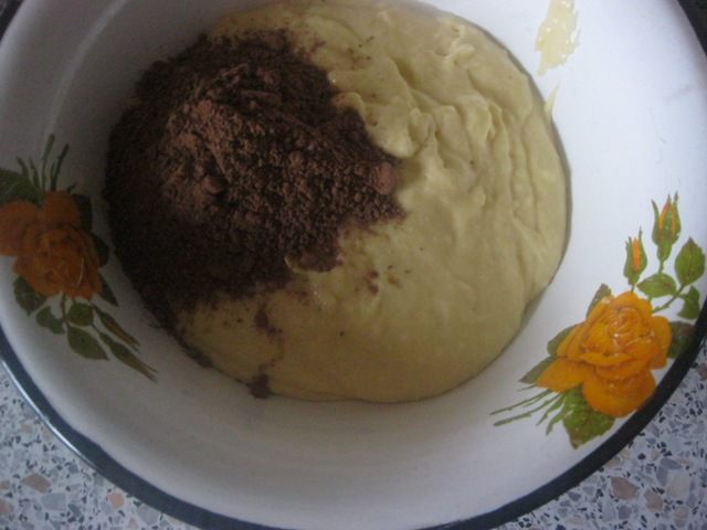 Тесто разделить пополам, в одну часть добавить какао...