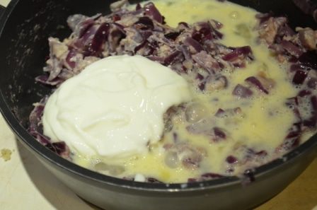 Влить сливки и всыпать муку, тушить 2-3 минутки на среднем огне. Посолить, поперчить, добавить немного мускатного ореха. Добавить по одному яйца и перемешать.