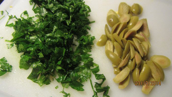 Готовый кускус заправляем оставшимся оливковым маслом (или добавляйте его по вкусу, я иногда кладу совсем немного сливочного, хотя это и не самый диетический вариант), лимонной цедрой, 1 ст.л. лимонного сока (можно и больше, добавляем по вкусу), солью и перцем. Добавляем кукурузу (если она консервированная, то сок сливаем), оливки и петрушку. Перемешиваем.