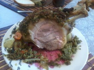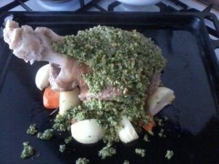 Для "рубашечки" Хлеб перебить в блендере в крошку,должно получится где-то стакан, добавить оливковое масло, чеснок, порезанную зелень, (я ложила мяту и петрушку, ), чуть соли и перца. Рульку сначала смазать горчицей, затем завернуть в "рубашечку" и в разогретую до 200 С духовку на 30 минут. Вот так она выглядит в разрезе. Угощайтесь!!!
