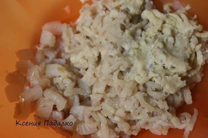 1/4 часть филе нарезать кубиком, остальное филе прокрутить в мясорубке с луком, чесноком и размоченным в воде хлебом.