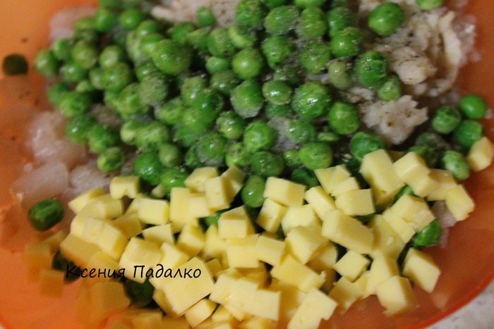 К фаршу добавить 3 ст.л. размороженного горошка, сыр нарезанный кубиками, соль, перец и яйцо. Тщательно все перемешать.