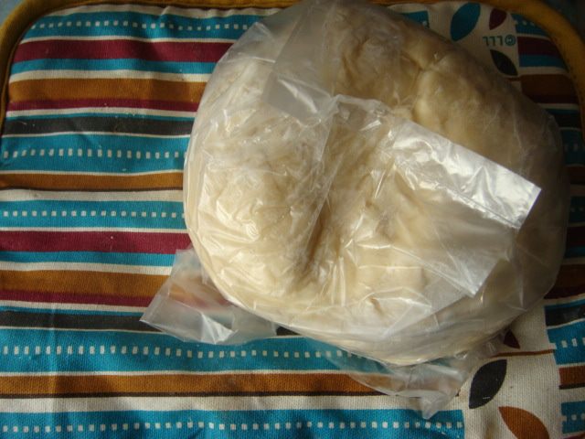 Замесить тесто,муку просеивать постепенно перемешивая с начало венчиком или ложкой, а потом руками, не очень тугое к рукам немного должно липнуть, обвалять в муке и положить в мешочек.