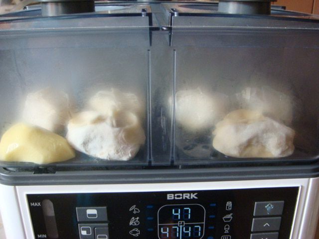 Уложить в пароварку на 45- 50 минут (я поставила 50 мин., т. к. налила холодную воду).